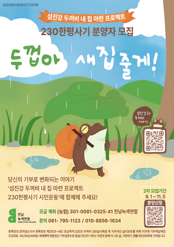 전남녹색연합은 이 소중한 생명이 안전하게 다음생을 이어갈 수 있도록 습지를 복원시키고, 해당습지를 매입하기 위해 ‘섬진강 두꺼비 내집 마련 프로젝트, 230평 한평사기 시민운동을 펼치고자 합니다.