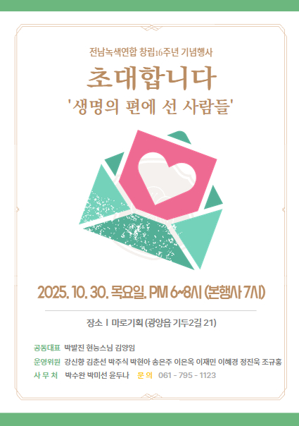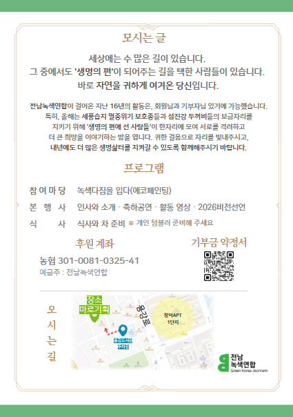 전남녹색연합 창립16주년 후원 약정서 작성과 참석여부 답변하기 :https://forms.gle/HdD3Jo1njb6bkqyP6