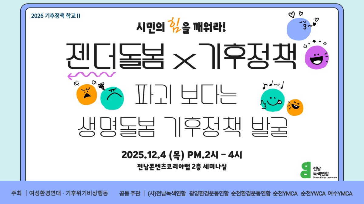 전남 지역이 직면한 기후위기 현안을 시민의 목소리로 모으고, 이를 2026년 지방선거 정책으로 연결하기 위해 마련되었습니다.